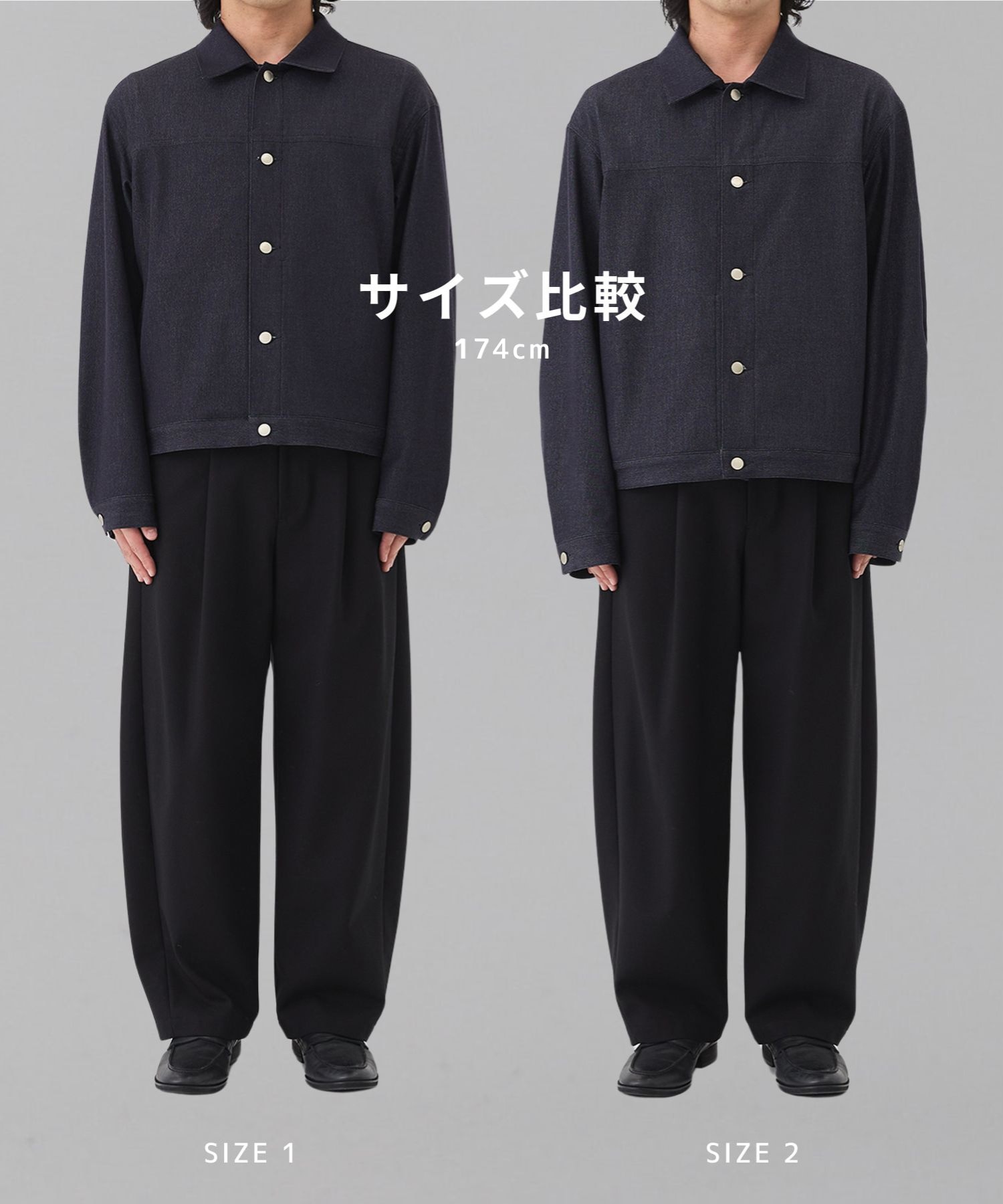 ゆとりのあるサイズ感と、 直線的なカッティングで都会的な印象を演出。 デニムのカジュアルさを抑え、 キレイ目なアイテムとも馴染むように設計。 セットアップはもちろん、 単体でも幅広いスタイリングに対応する一着。