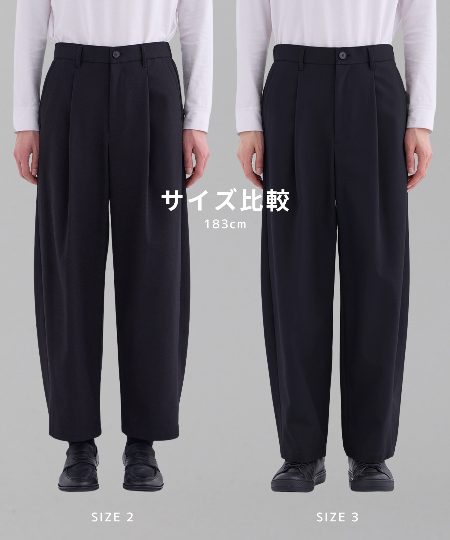 ・ゆったりとしたシルエットかつ、足元がスッキリとしているため、スタイルアップ効果もあり、スニーカーからローファーなど幅広い靴とのスタイリングも可能