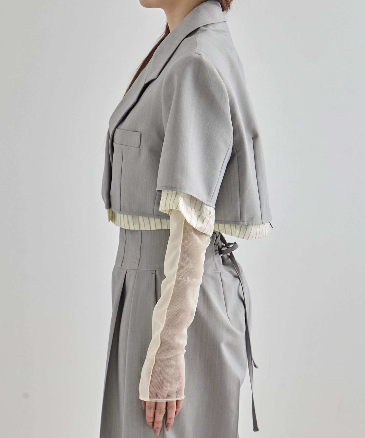 ベーシックなテーラードジャケットを切り落としたような、裏地が覗くデザイン。